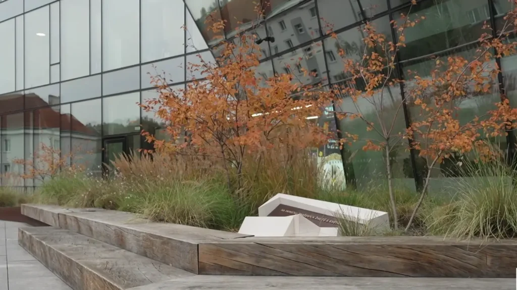 Tematický pomník ztvárnil akademický sochař Pavel Filip ze třech pískovcových bloků doplněných bronzovým segmentem. Pomník je osazený do travnaté okrasné…